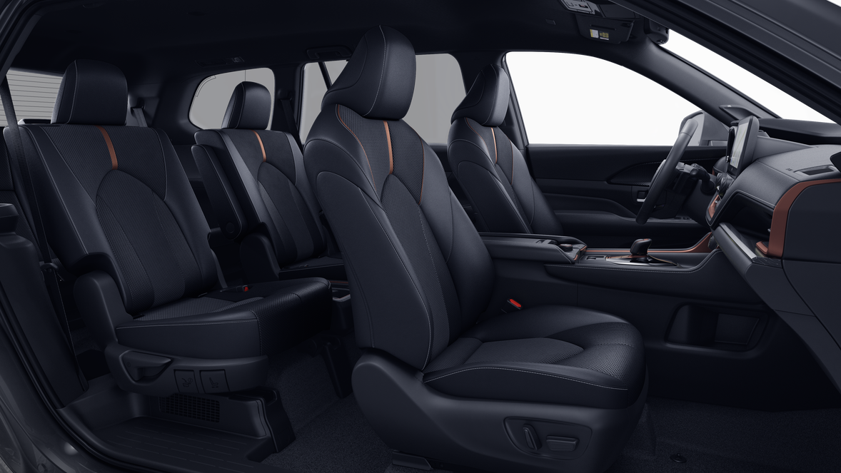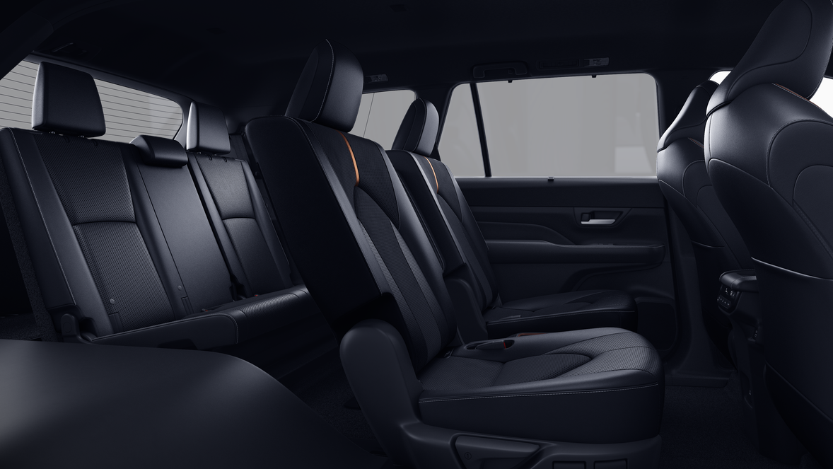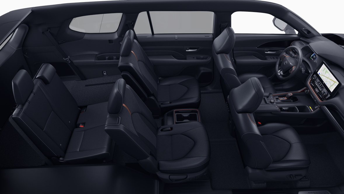 • 7-passenger seating with second-row fold-down captain's chairs and fold-down inboard armrests, adjustable headrests and two cup holders mounted on the floor; and 60/40 split, fold-down third-row seats with sliding headrests and recline function